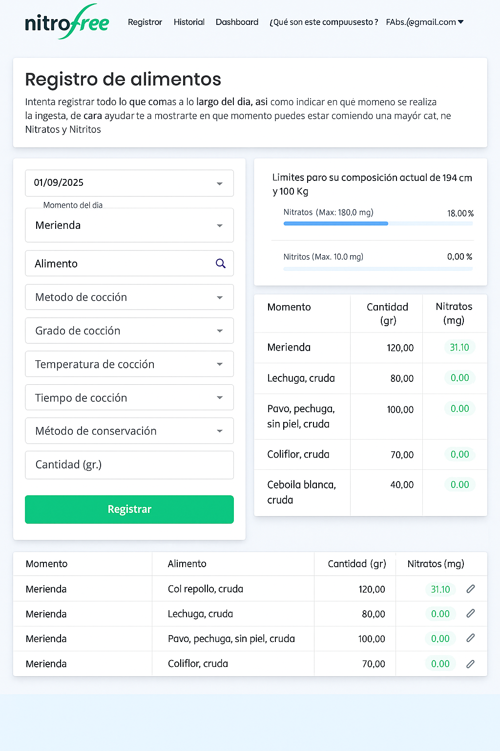 Gracias a NitroFree, podrás registrar tus comidas y tener controladas las ingestas de Nitritos y Nitratos.